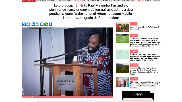 Le professeur émérite Paul Malembe Tamandiak, pionnier de l’enseignement du journalisme admis à titre posthume dans l'ordre national Héros nationaux Kabila-Lumumba, au grade de Commandeur