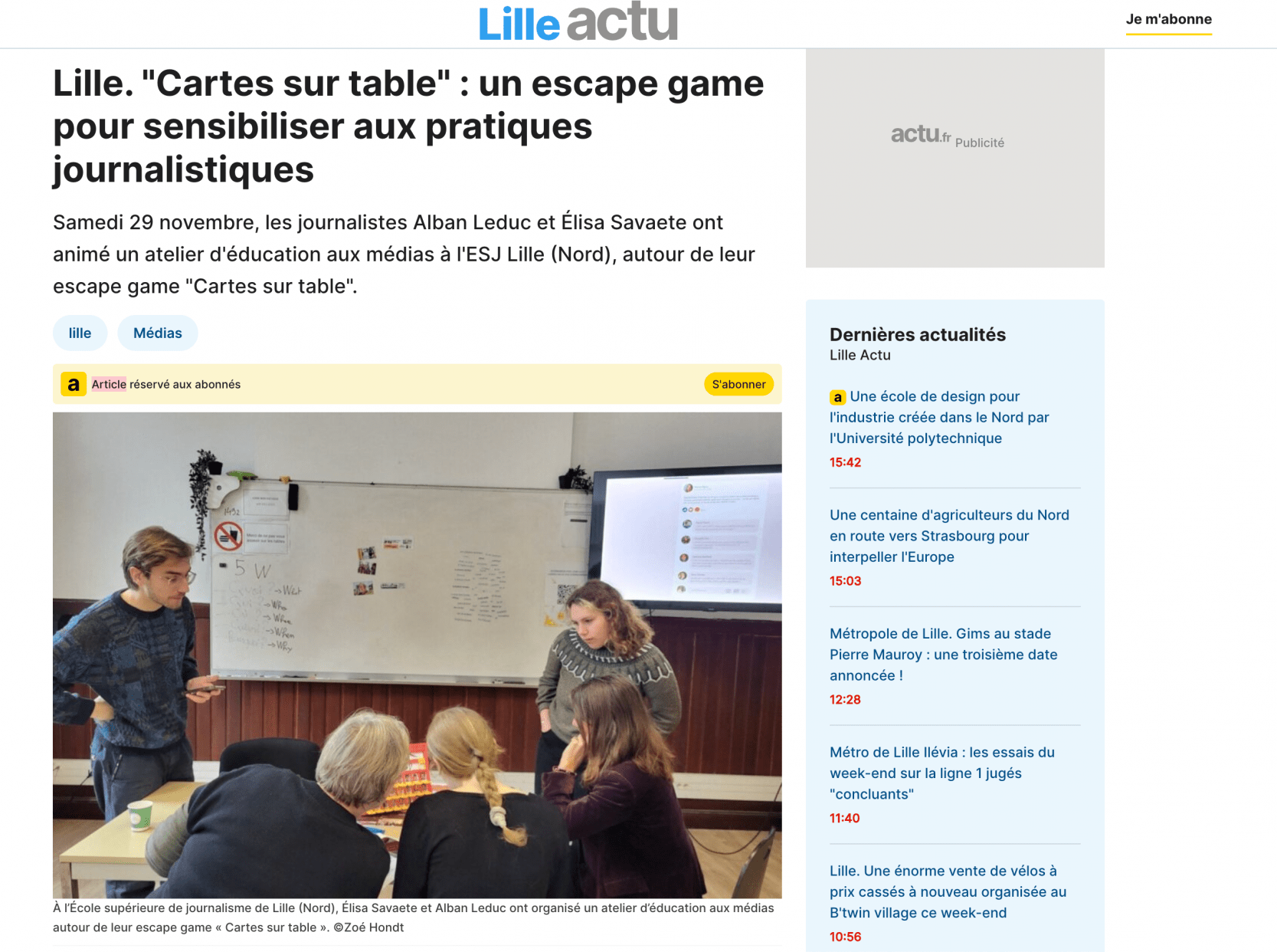 Pour découvrir l'article : https://actu.fr/hauts-de-france/lille_59350/lille-cartes-sur-table-un-escape-game-pour-sensibiliser-aux-pratiques-journalistiques_63517647.html